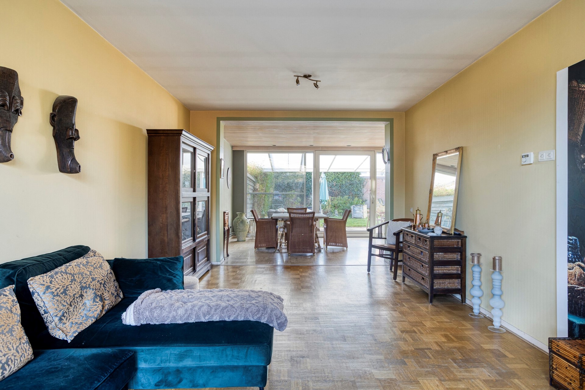 De doorzonwoonkamer heeft een mooie lichtinval door de grote raampartij met elektrisch bedienbaar rolluik aan de voorzijde en de volledige glazen achterzijde met schuifpui. De achterzijde van de woning is over de volle breedte uitgebouwd. De zitkamer is voorzien van een parketvloer, in de uitbouw ligt een travertin vloer.