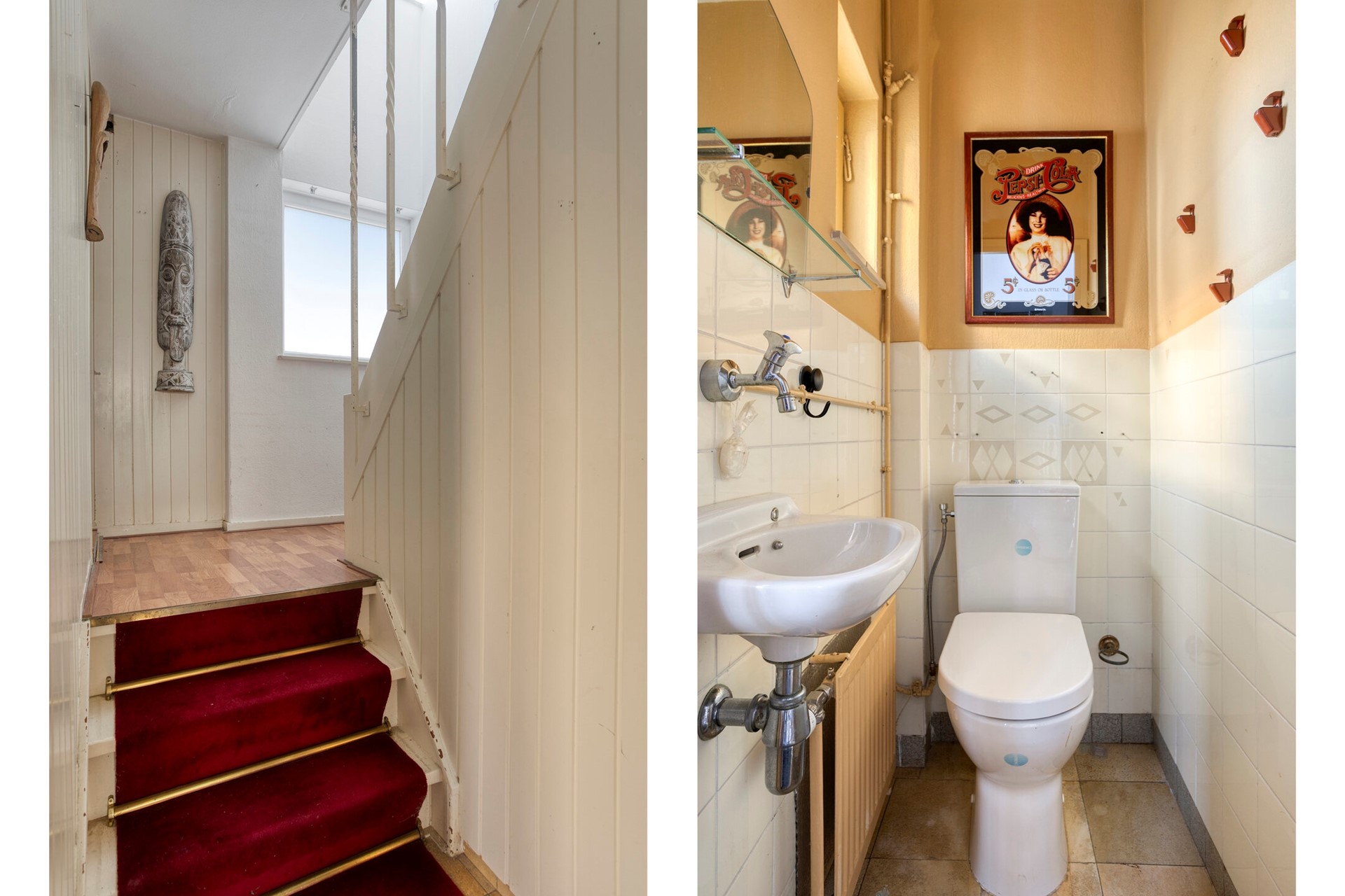 Entree met opgaande trap, ruime trapkast, half betegelde toiletruimte met verhoogd closet en fonteintje, toegang tot de woonkamer en toegang tot de keuken.