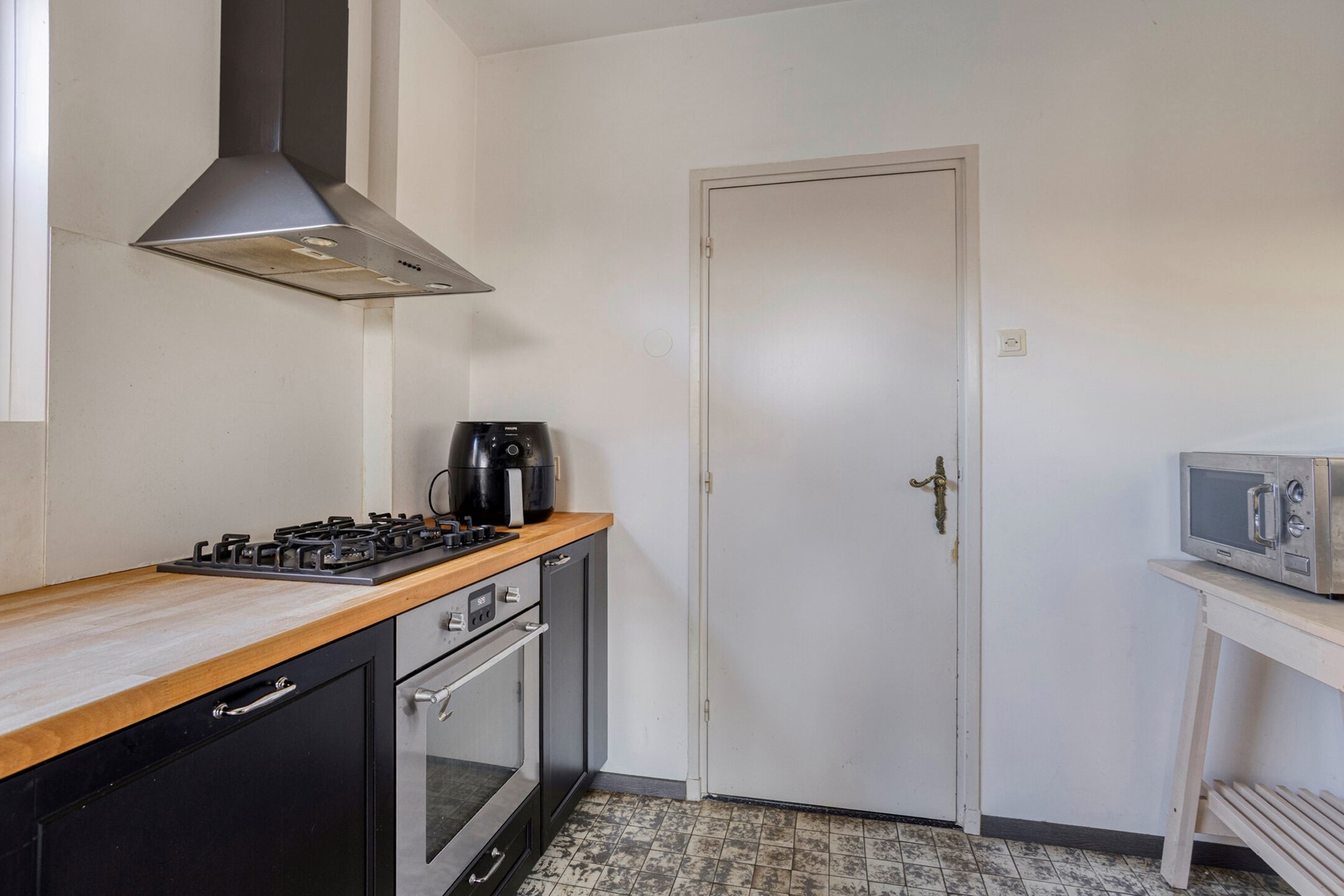 De gesloten keuken is voorzien van een gaskookplaat, afzuigkap, hetelucht-oven, vaatwasser, koelkast en vriezer. Er is voldoende opbergruimte. Het raam in de zijgevel geeft uitzicht op de naastgelegen oprit.