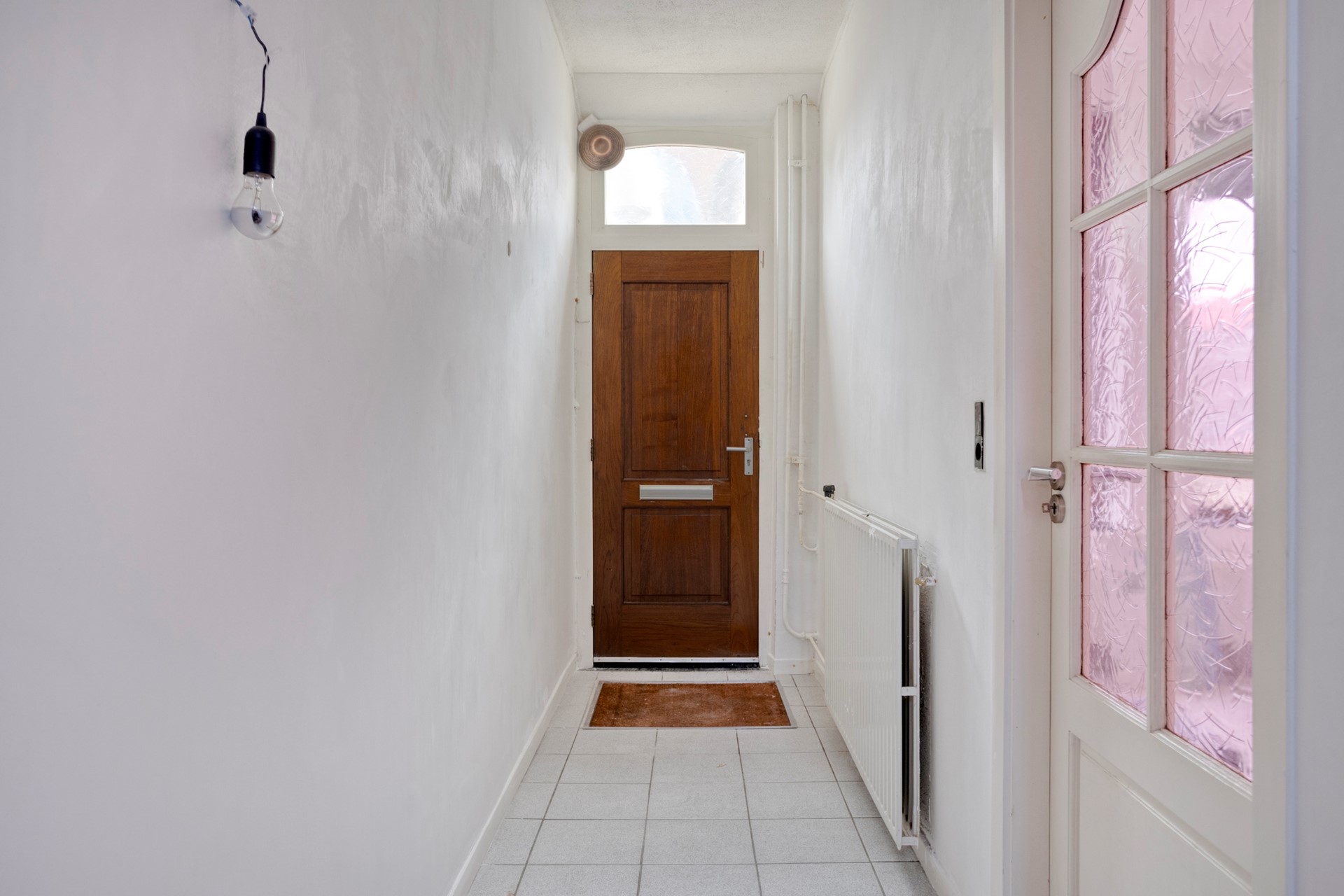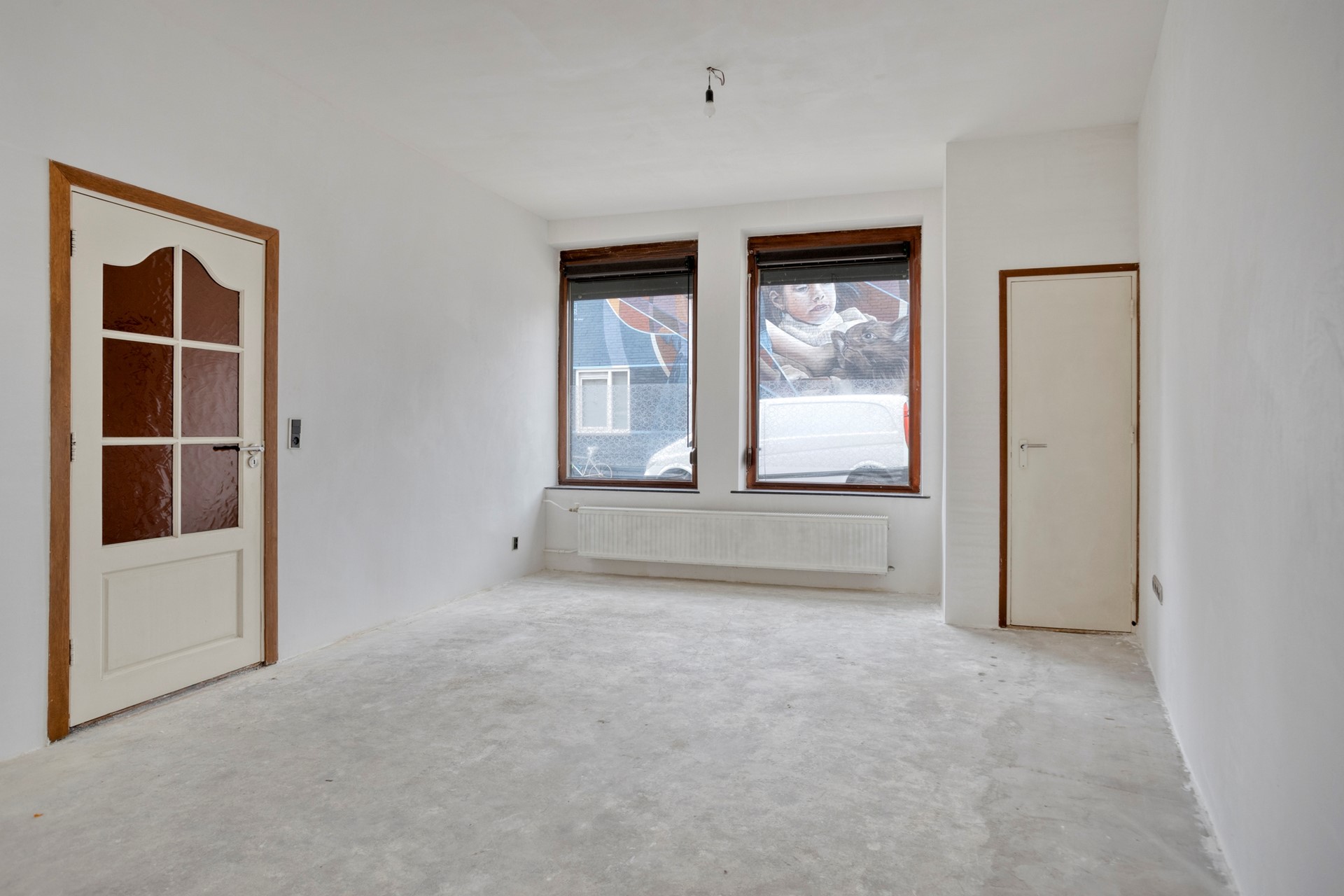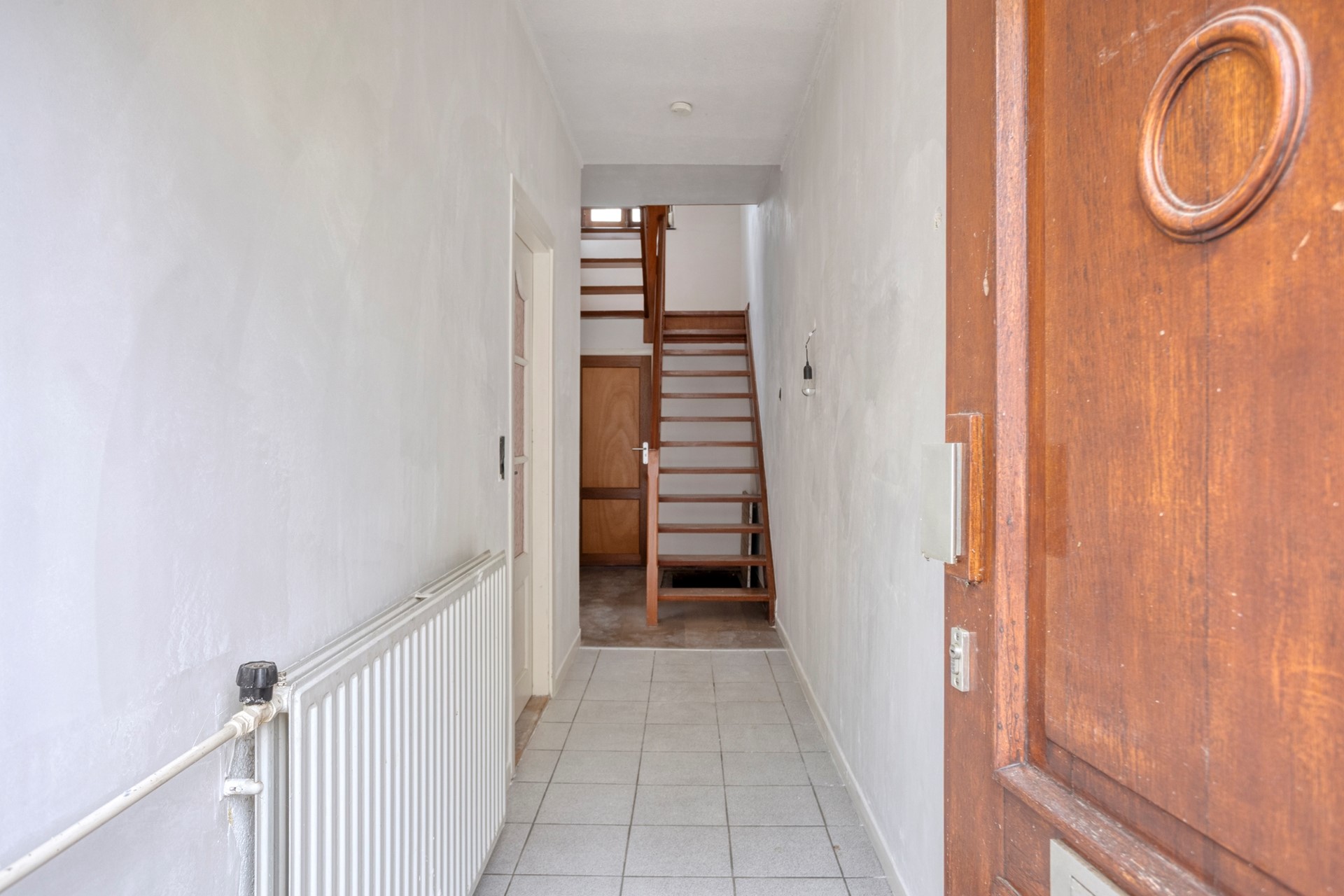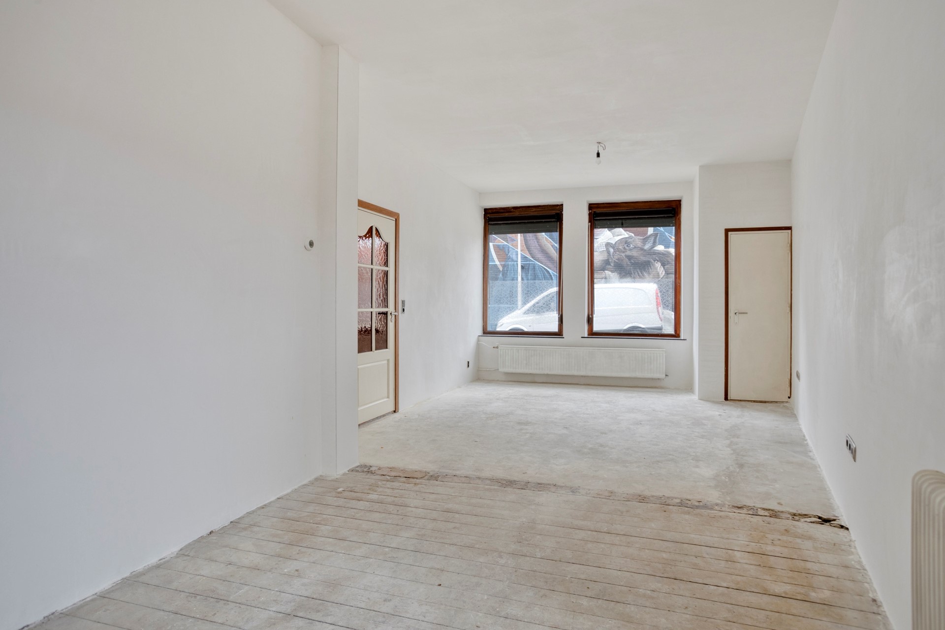 In de hal bevindt zich de toegang naar de kelder, het toilet, de trapopgang naar de eerste verdieping en de toegang tot de woonkamer. Door de grote raampartijen in zowel de voorgevel als de zijgevel van de woning ontstaat er een mooie lichtinval. Het plafond in de woonkamer is vernieuwd en alle wanden zijn voorzien van nieuw stucwerk. De oude vloerbedekking is gemakshalve al verwijderd.
