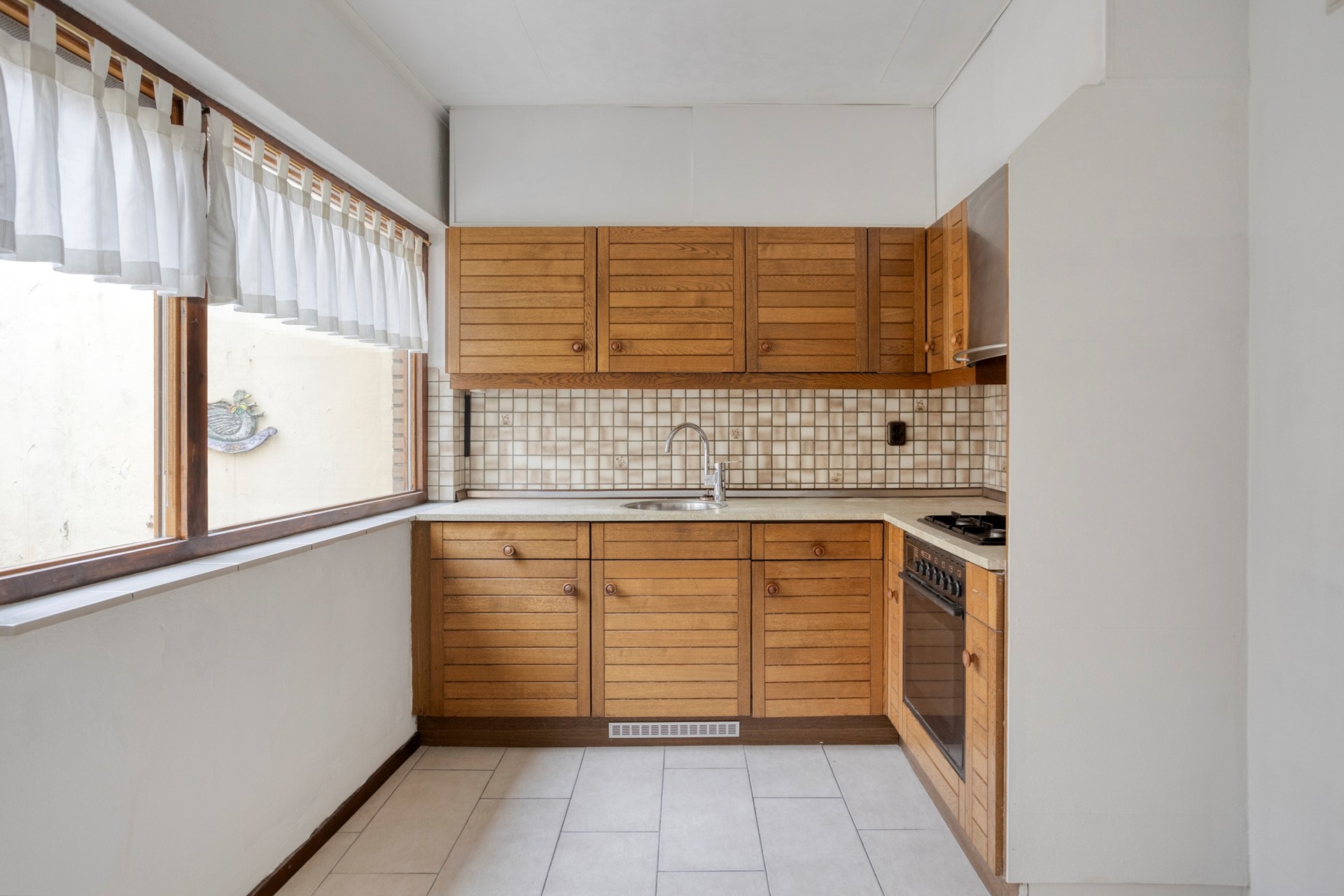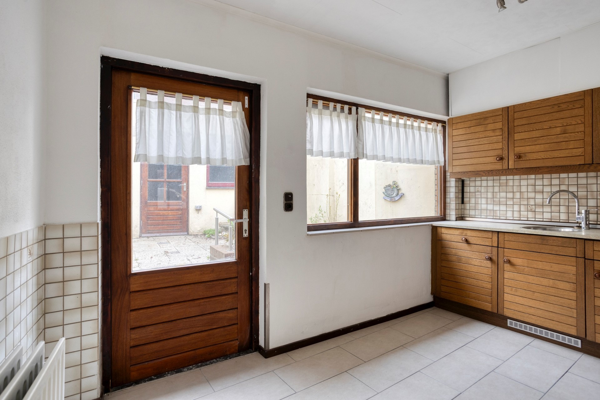 De eenvoudige keuken ligt aan de achterzijde van de woning.