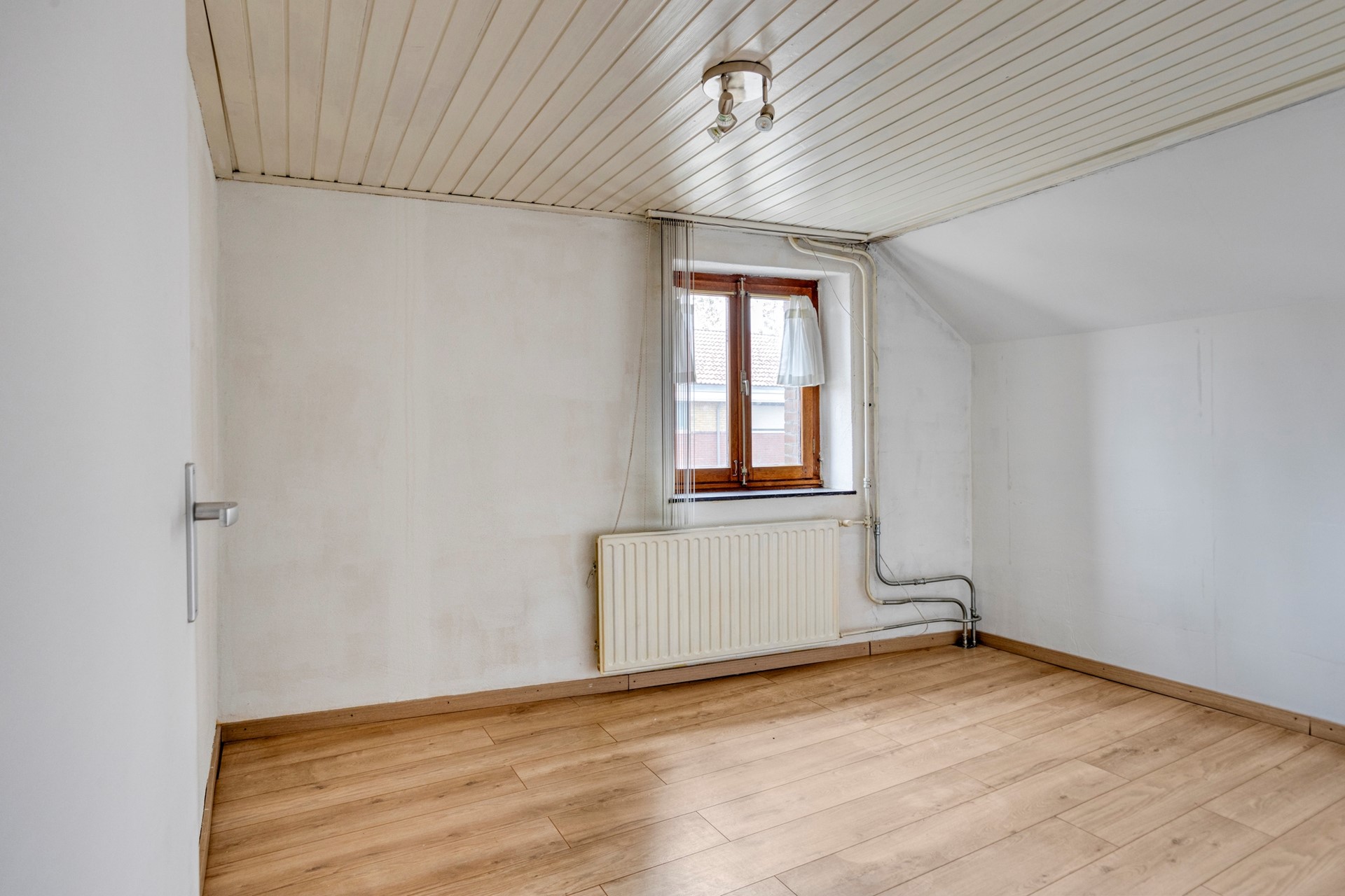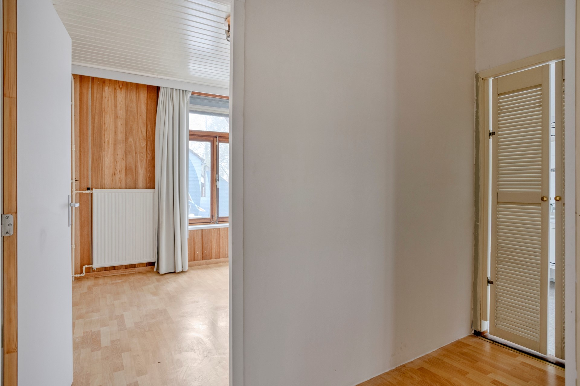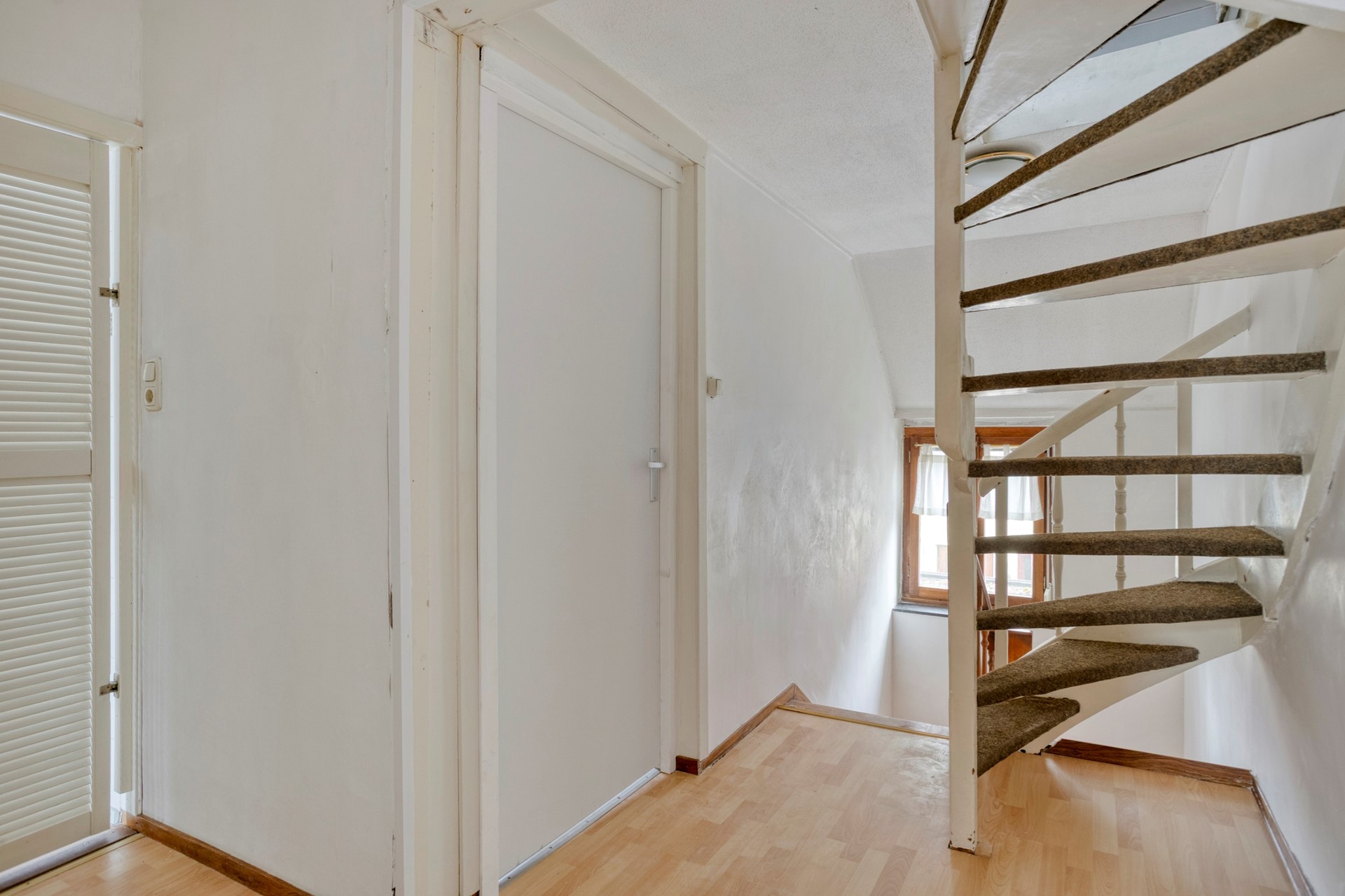 De overloop is voorzien van laminaat en geeft toegang tot twee slaapkamers, de badkamer en de trap naar de zolder.