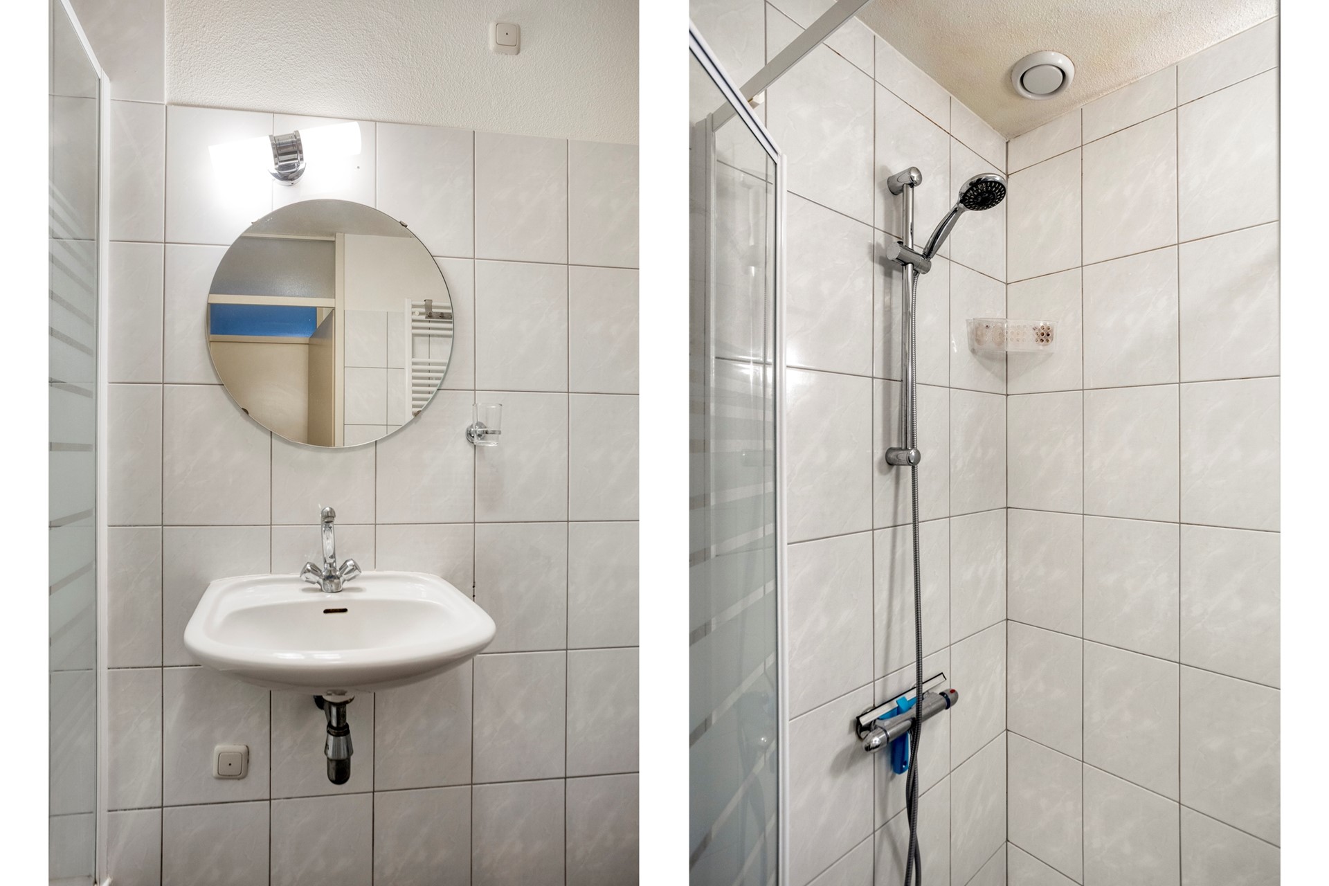 De badkamer is vrijwel geheel betegeld en voorzien van een douchecabine en wastafel. Tevens is er ruimte om de wasmachine en droger te plaatsen.