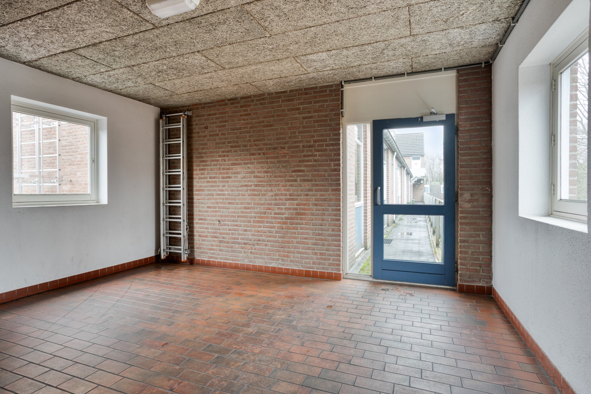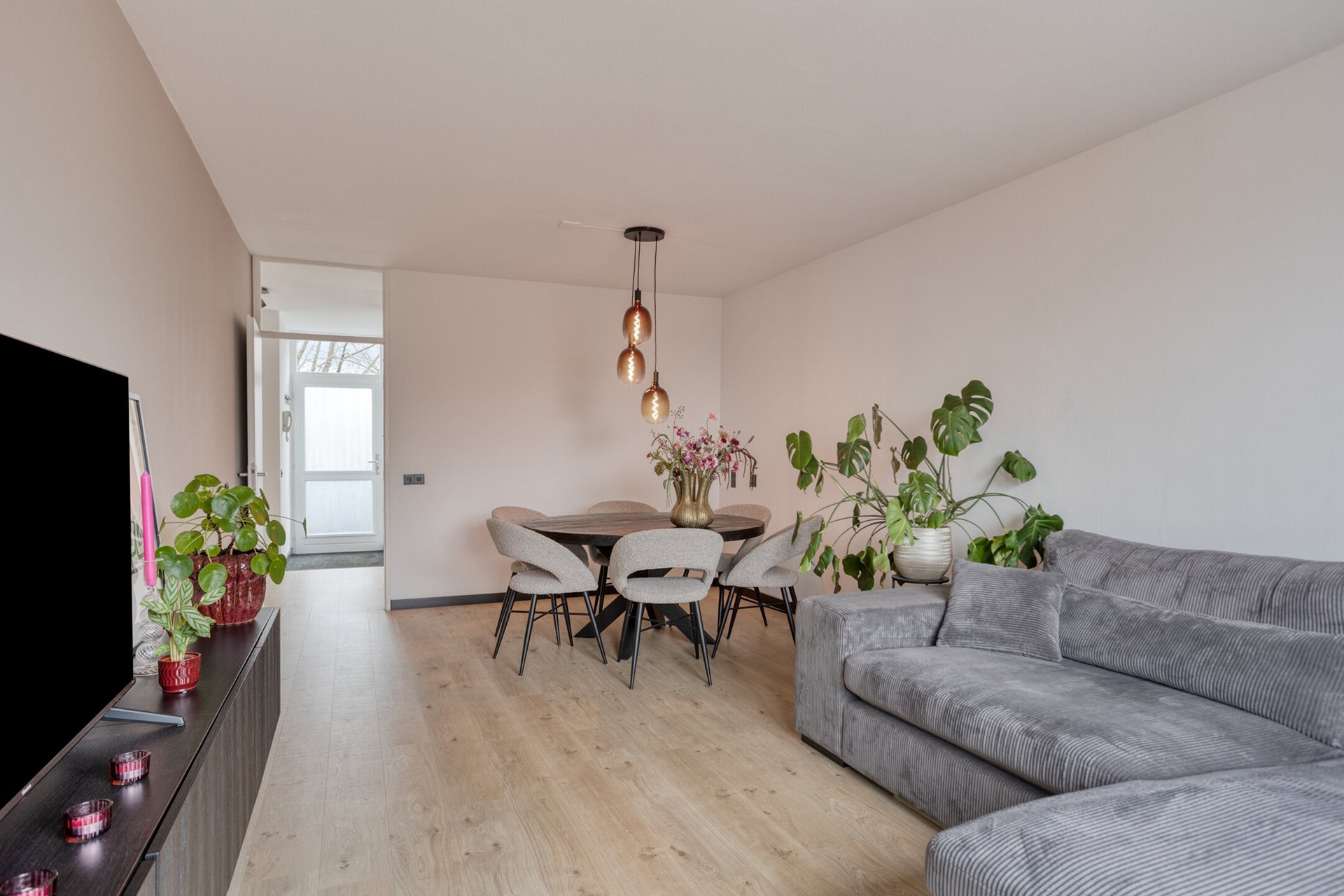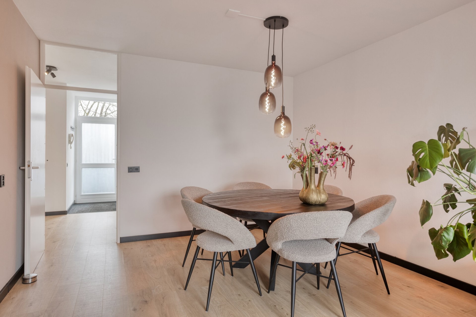 De hal geeft toegang tot de meterkast, toiletruimte, woonkamer, keuken, twee slaapkamers en de badkamer.