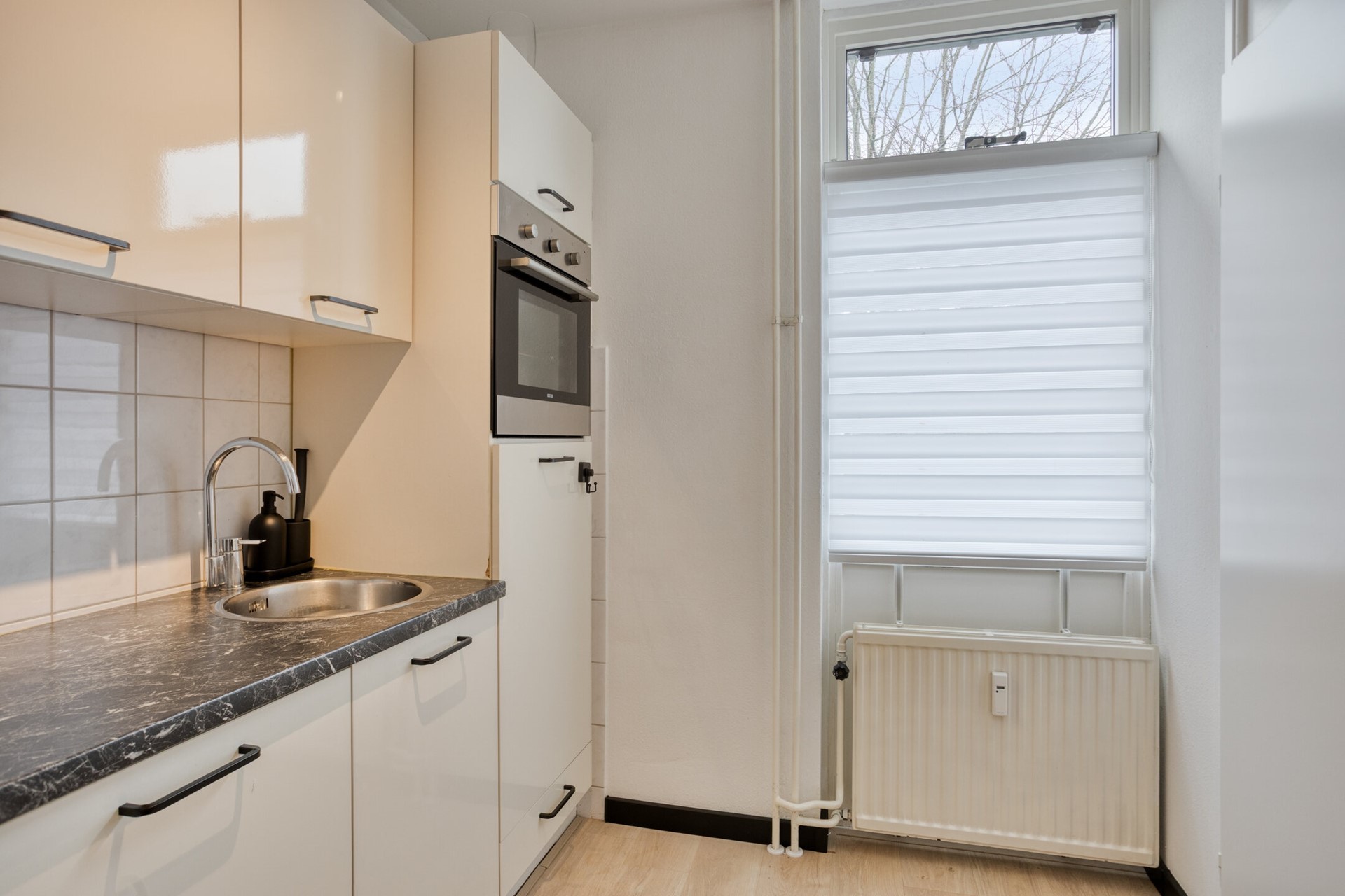 De zonnige woonkamer heeft een mooie lichtinval door de grote, op het zuiden gelegen, raampartij en geeft toegang tot het balkon dat tevens op het zuiden gelegen is. De woonkamer is voorzien van een keurige laminaatvloer die is doorgelegd in alle ruimtes behalve het toilet en de badkamer.