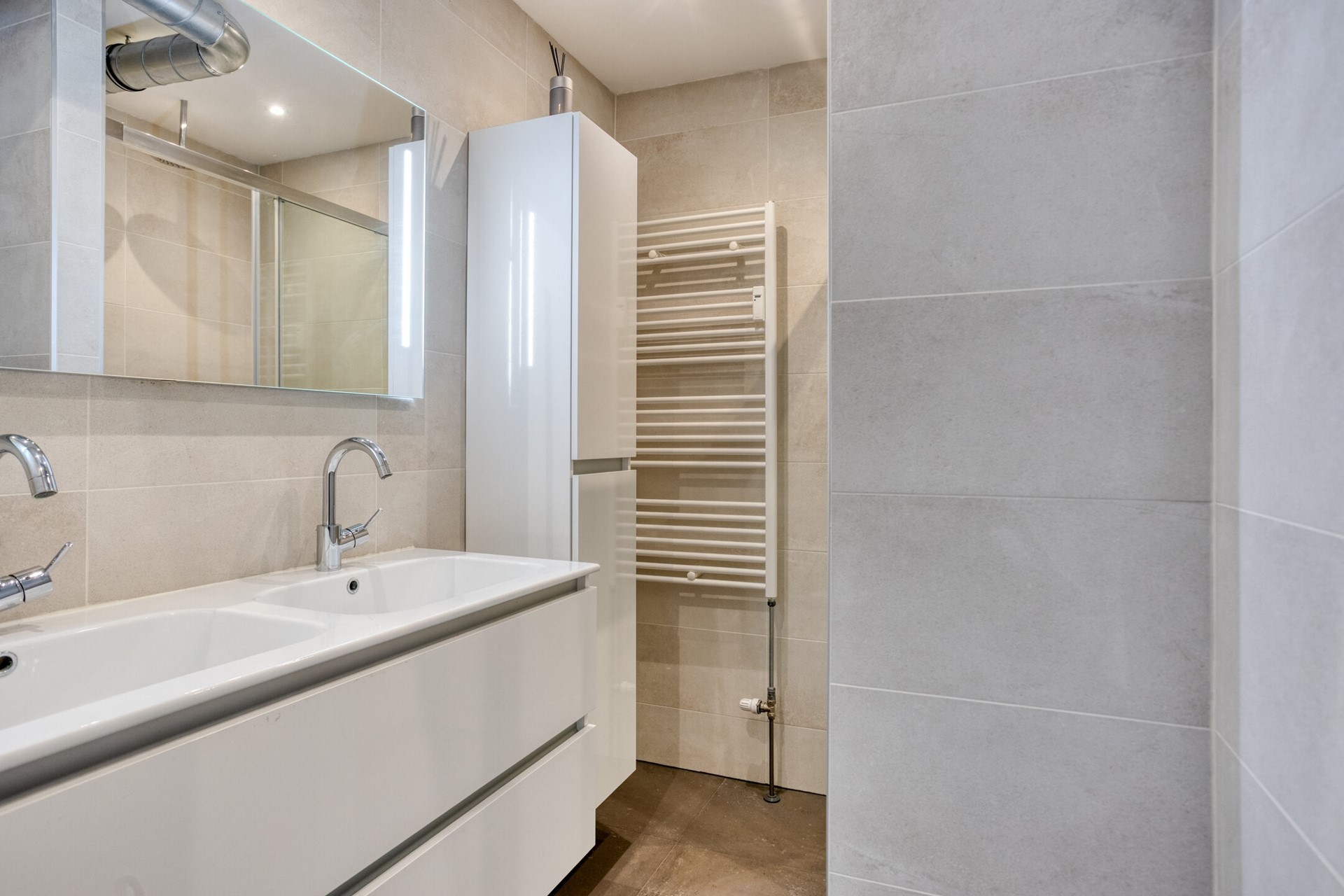 De nette badkamer is voorzien van een dubbele wastafel in badkamermeubel, inloopdouche met hardglazen deur en een handdoekradiator.